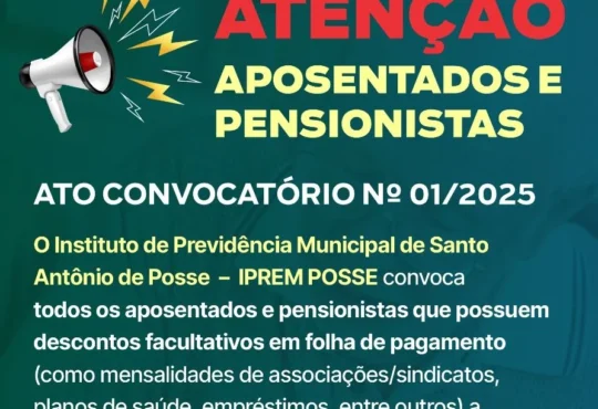 📢 ATENÇÃO APOSENTADOS E PENSIONISTAS DO IPREM! O IPREM POSSE CONVOCA todos que possuem descontos facultativos em folha de pagamento para regularização das consignações. ...