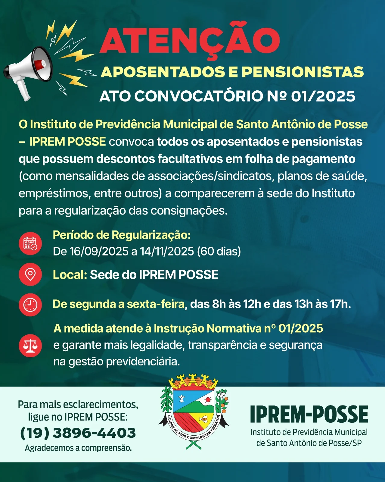 O IPREM POSSE CONVOCA todos que possuem descontos facultativos em folha de pagamento para regularização das consignações.